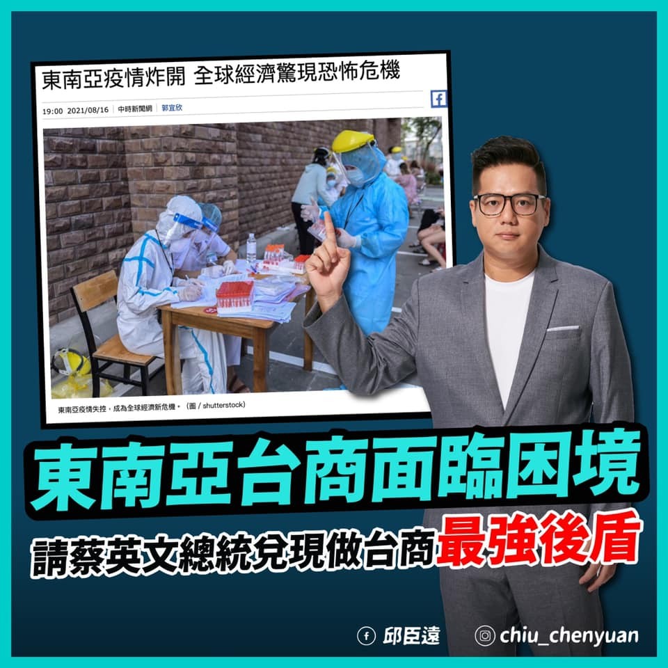 新南向政策國家疫情再度衝擊台商產業鏈,民眾黨立委邱臣遠18日於臉書發文,要求總統蔡英文做「台商最強後盾」,協助台商抗疫與度過危機。