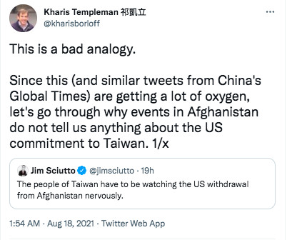 針對近日阿富汗的情勢,中共官媒與部分國民黨人士將台灣與阿富汗類比,拋出「疑美論」。對於相關的類比,長期專研台灣議題的史丹佛學者祁凱立提出反駁,強調這樣的比喻非常糟糕。