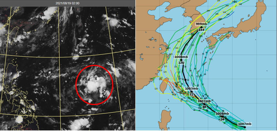 ▲今(19)日2時「熱帶擾動 (左圖)」(「中央氣象局」定為一般低壓,日本定為「熱帶低壓」,美國則稱為「熱帶低壓之殘餘」)在關島西方海面。最新(18日20時)美國系集(GEFS)模式模擬(右圖)顯示,預測向西北轉北,將在琉球附近迴轉。(圖/翻攝三立準氣象· 老大洩天機)