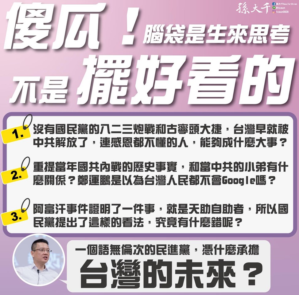 孫大千今(19)日在臉書表示,傻瓜!腦袋是生來思考的,不是擺著好看的。列舉三位民進黨立委的幾個神邏輯: