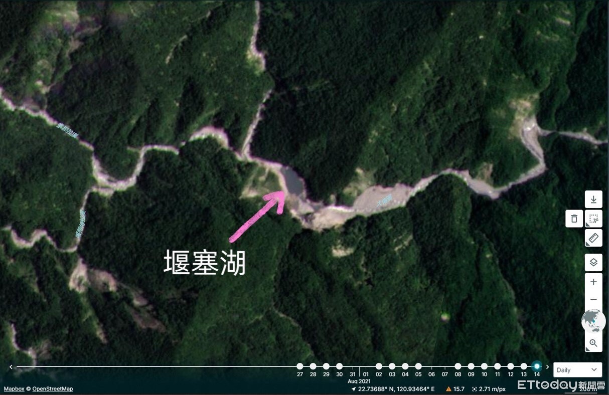 ▲透過衛星影像確認堰塞湖蓄積水體明顯縮小,研判大部分壩體已潰決,導致蓄水量大幅降低。(圖/台東林管處提供)