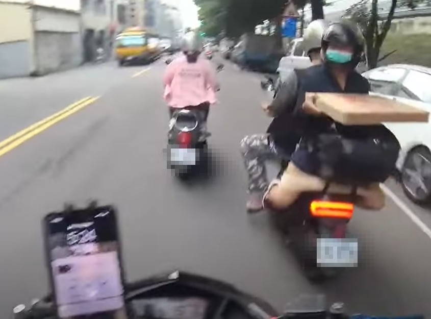 ▲三寶絕命上路,雙手懸空捧PIZZA、腳則反弓在踏板上!(圖/翻攝Wowtchout-地圖型行車影像分享平台)