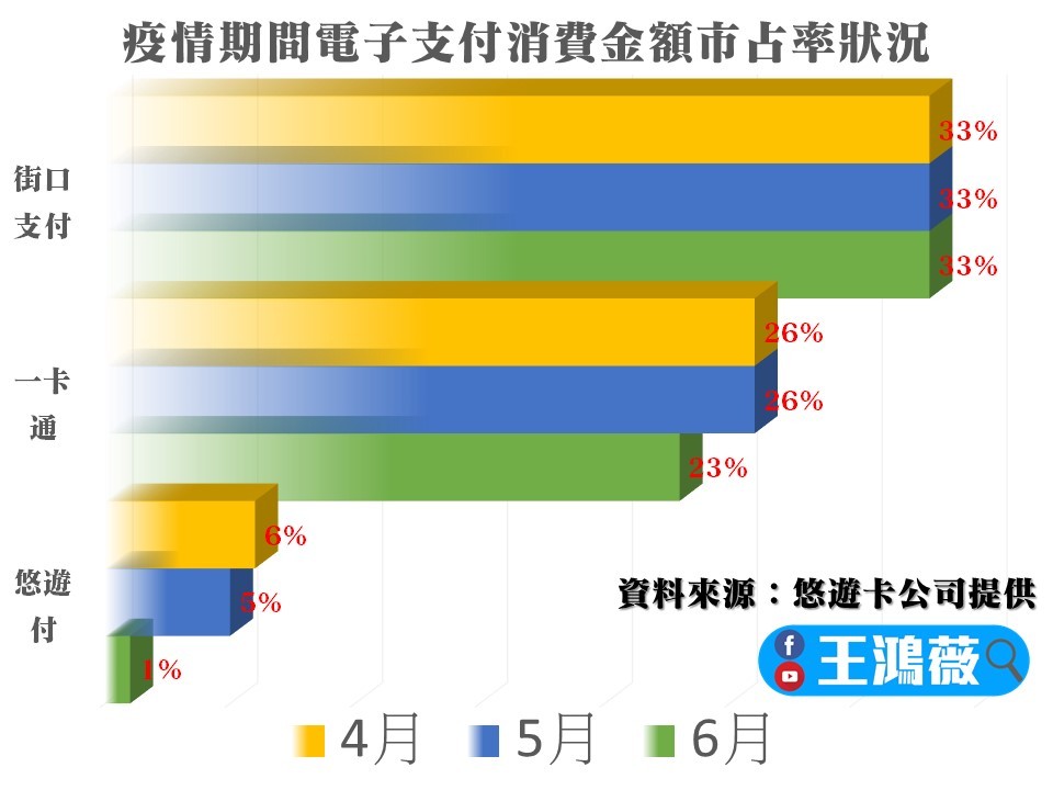 王鴻薇表示,長期觀察悠遊付狀況,會發現悠遊付狀況低迷,尤其是消費金額,疫情下,原本4月還有6%,到了6月直接跌到1%,排名也落到第7名,代表很多民眾沒有使用動機,雖然疫情期間大眾交通都減少,但這絕對不該是藉口。