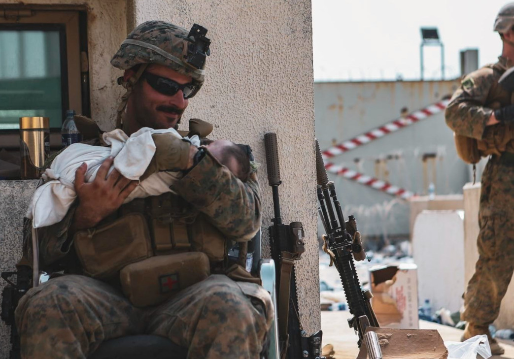 塔利班組織(神學士,Taliban)奪下阿富汗政權後,許多人急著搭機逃離,許多父母在不得已的情況下,選擇將孩子傳過鐵絲網,希望能跟著英美軍隊離開。美國海軍陸戰隊就在臉書po出一張大兵將嬰兒抱在懷裡安撫的照片,目前不清楚孩子的父母人在何處。