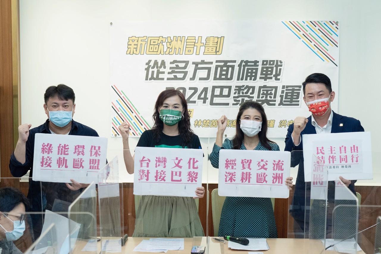 民進黨立委林楚茵、林宜瑾、洪申翰、台灣基進立委陳柏惟23日上午於立法院召開「新歐洲計劃,從多方面備戰2024巴黎奧運」記者會。林楚茵表示,下一次的奧運即將於法國舉辦,台灣必須以斐然的外交成績為基石,並從多方面深化台歐關係。