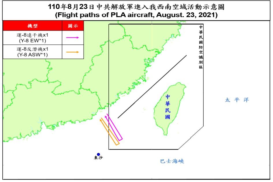 根據國防部公布的資料顯示,截至8月23日,共軍在8月派遣26架共機擾台,包括:8月8日運8反潛機1架;8月11日運8電偵機1架;8月12日運8遠干機1架、運8電偵機1架、殲16機4架、運8反潛機1架;8月15日運8反潛機1架,8月16日運8反潛機1架;8月17日運8反潛機1架、運8遠干機1架、空警500機1架、殲16機6架、轟6K機2架;8月19日轟6機1架;8月22日運8反潛機1架;8月23日運8遠干機1架、運8反潛機1架。