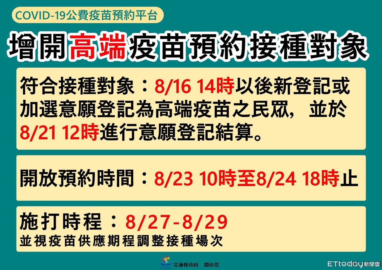 衛生局長朱家祥也針對23日開始的高端疫苗接種部分說明,花蓮縣自8月16日至20日已完成預約有5168人,因預約接種人數未達預期,所以中央疫情指揮中心增開高端疫苗預約接種為今日上午10時至8月24日18時止,施打時程為8月27日至8月29日。高端疫苗開始施打首日,花蓮縣目前未出現施打民眾有不良反應之狀況。