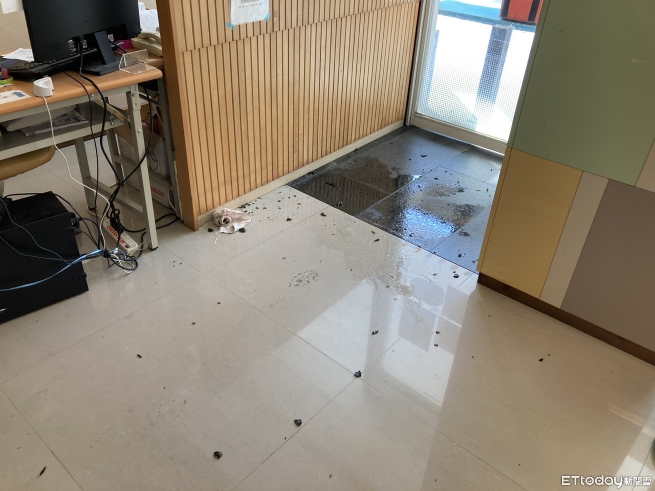 ▲41歲謝姓男子找醫師理論被拒後,竟「亮槍」還丟擲易燃甲苯玻璃瓶,現場散布玻璃碎片與甲苯液體。(圖/記者林悅翻攝,下同)