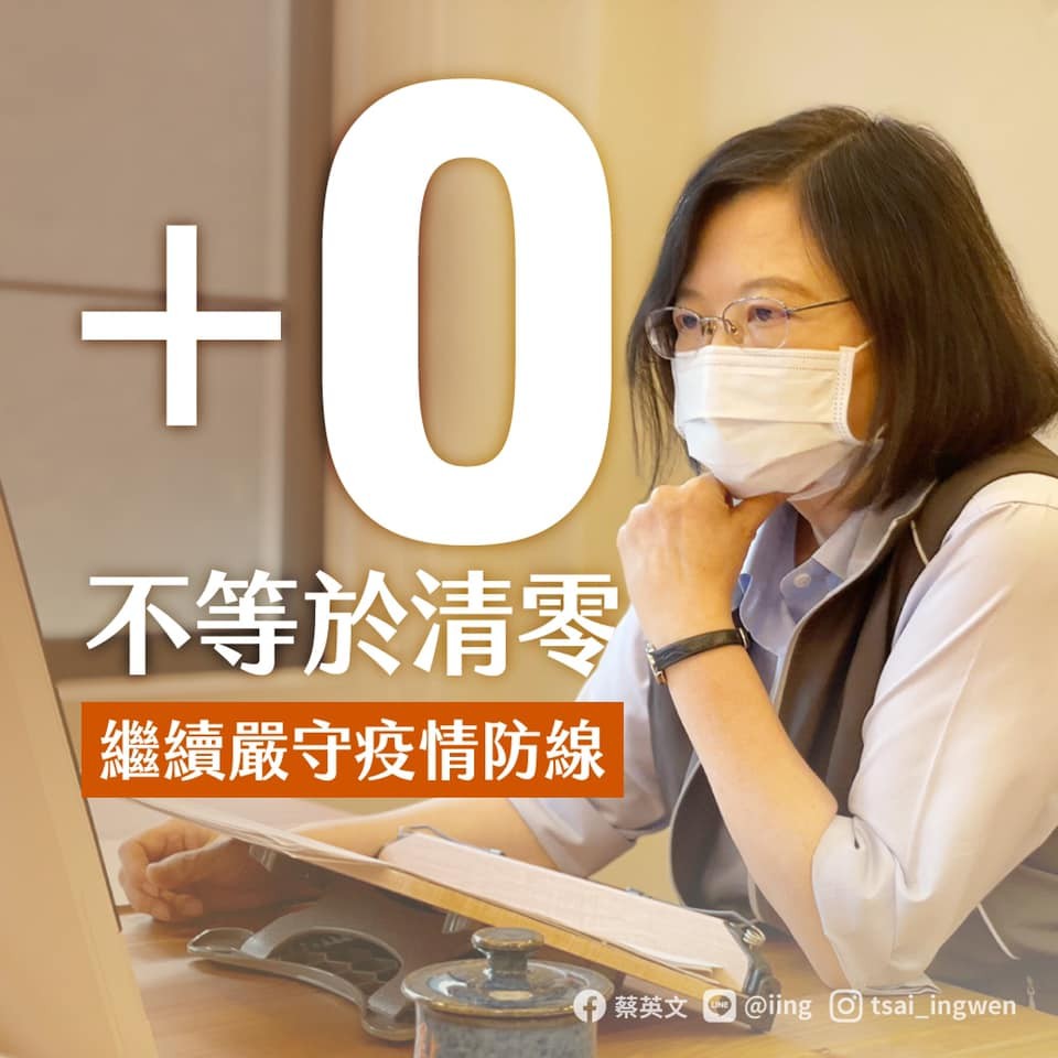 蔡英文在臉書發文指出,今天本土案例「+0」,但加零不等於清零,政府會繼續嚴守疫情防線,除了會緊盯國產疫苗進度,也會持續催促外購疫苗儘早到貨。