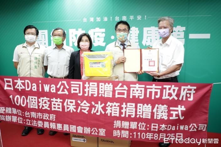 衛生局進一步說明,因應疫苗冷藏保存的需要,大和事業股份有限公司董事長陳秋明主動發起捐贈,籌措數百個日本「Daiwa攜帶式保冷箱」,提供疫苗運送保存使用,25日捐贈台南市政府100個攜帶式保冷箱,數量為單一縣市最多。