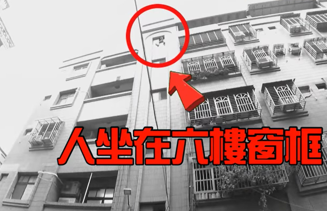 新北市消防局消防宣傳科25日在粉專發表影片,畫面由消防員第一人稱視角呈現,日前一名男子坐在一棟公寓的6樓樓梯間窗口,身旁僅由窗戶和窗框稍微卡住,人就坐在薄薄的牆上,雙腳懸在半空中。