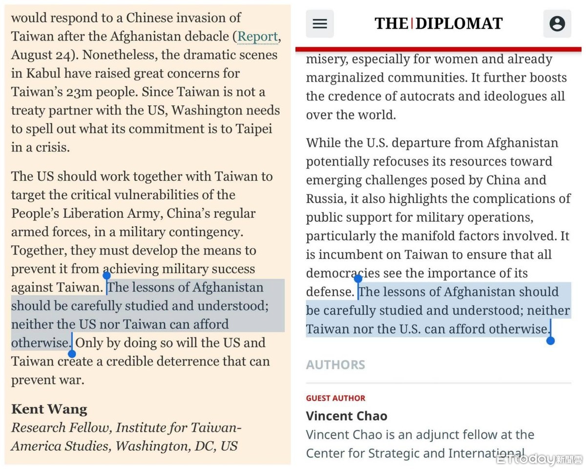 趙怡翔8月17日投稿於外交家的文章結論,與台美關係研究中心8月24日刊登於「金融時報」的投書皆包含同一句話「The lessons of Afghanistan should be carefully studied and understood; neither Taiwan nor the U.S. can afford otherwise.」。