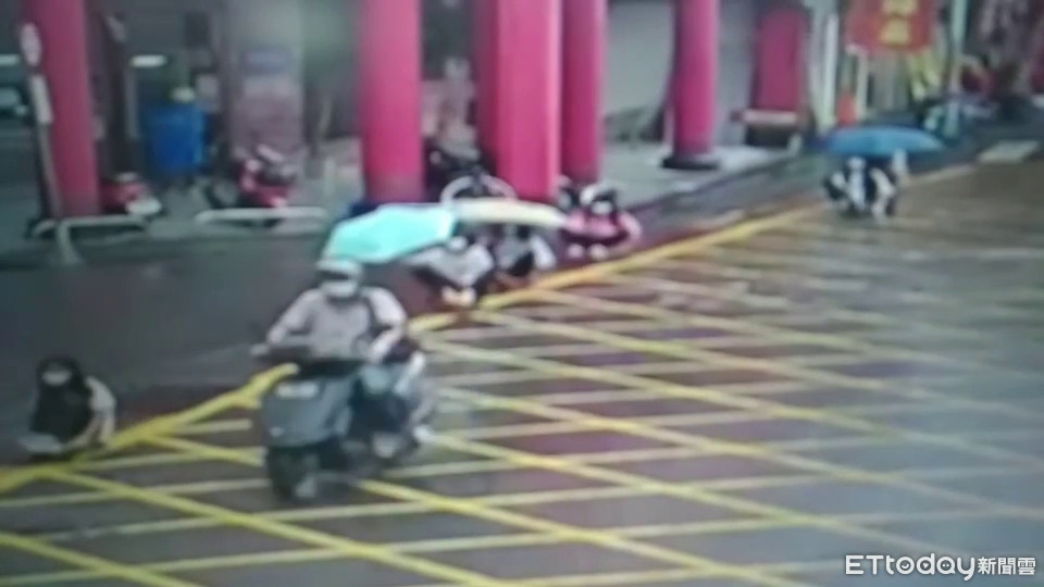也有周邊店家監視錄影畫面也清楚拍下共8名約莫國小年紀的女孩通過的身影,排頭的1位溜滑板車、其他7人坐乘滑板,有人沒拿傘,還有2人「雙載」坐乘同一部滑板。