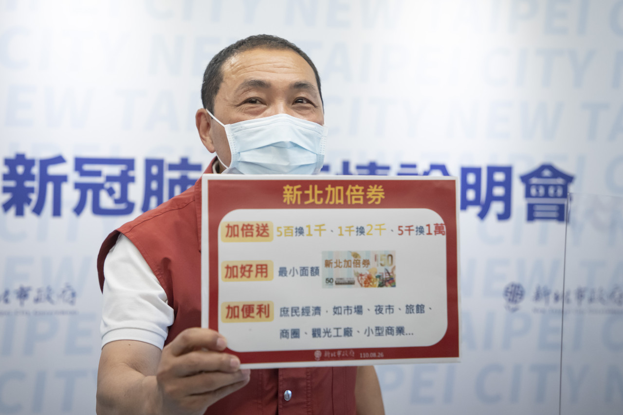 行政院昨天公布五倍券振興方案,新北市長侯友宜隨後宣布加碼推出「加倍券」,可以500換1000、1000換2000,最高5000換10000,總共31萬份,搭配中央五倍券來使用,給市民「加倍送、加好用,加便利」,細節將於9月中旬公布。