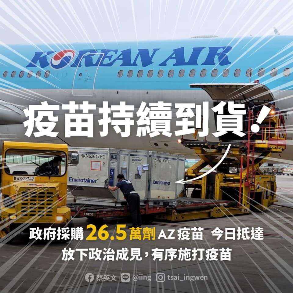 自購26.5萬劑AZ疫苗於今(27)日中午抵達台灣,總統蔡英文隨後在臉書發文表示,我們會在最短時間內完成檢驗封緘作業,儘快提供給大家施打。此外,對於高端疫苗施打後爆出4起死亡的不良反應,引發各界議論,蔡英文也呼籲不要過多的政治算計。