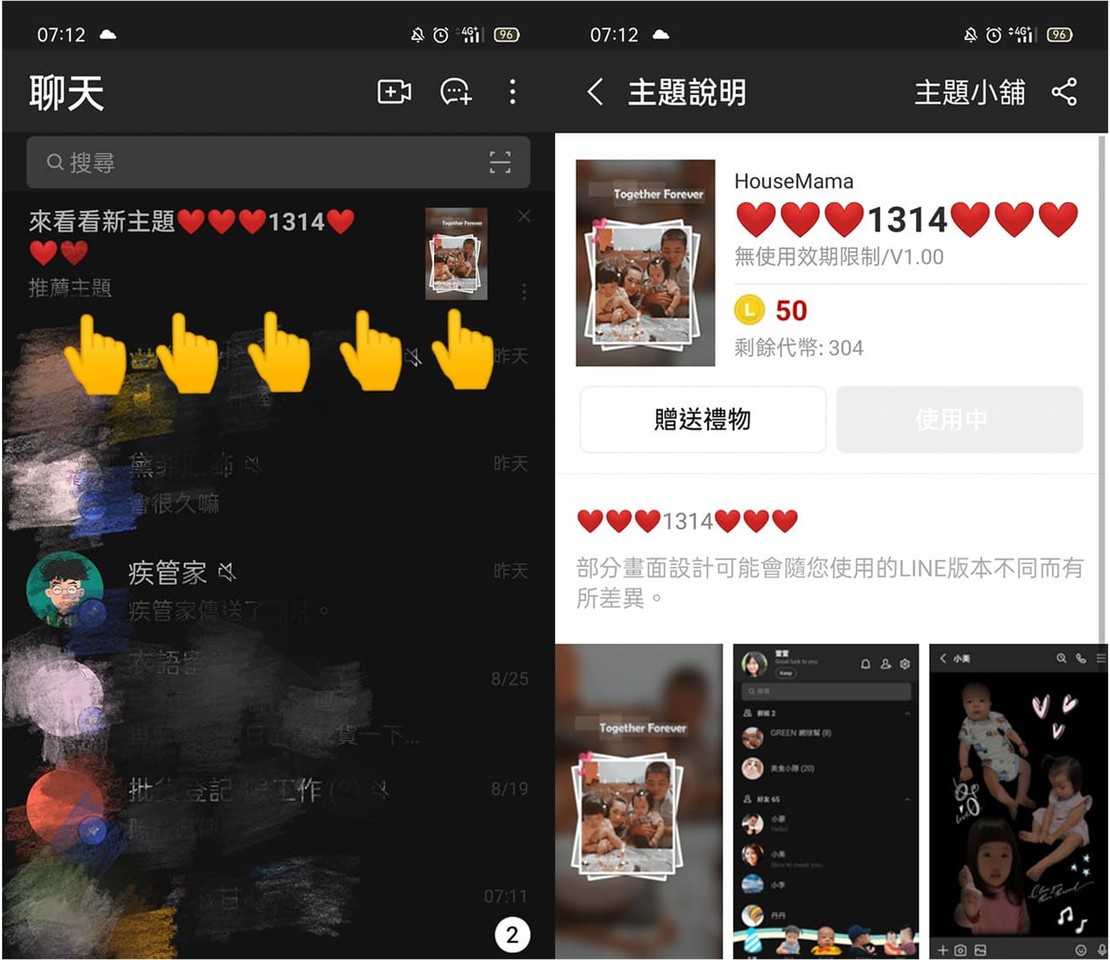 原PO在臉書社團「爆廢公社公開版」發文分享,一早看到LINE的推薦主題,新主題名稱是「❤️❤️❤️1314❤️❤️❤️」,以為買了之後可以更改成自己想要的圖片,沒想到跟原本設想的不一樣,主題當中的照片是不能更改的,讓原PO哭笑不得地表示,「別人的全家福,別人的小孩,別人的老公,我到底幹嘛買啦,被自己笑死。」