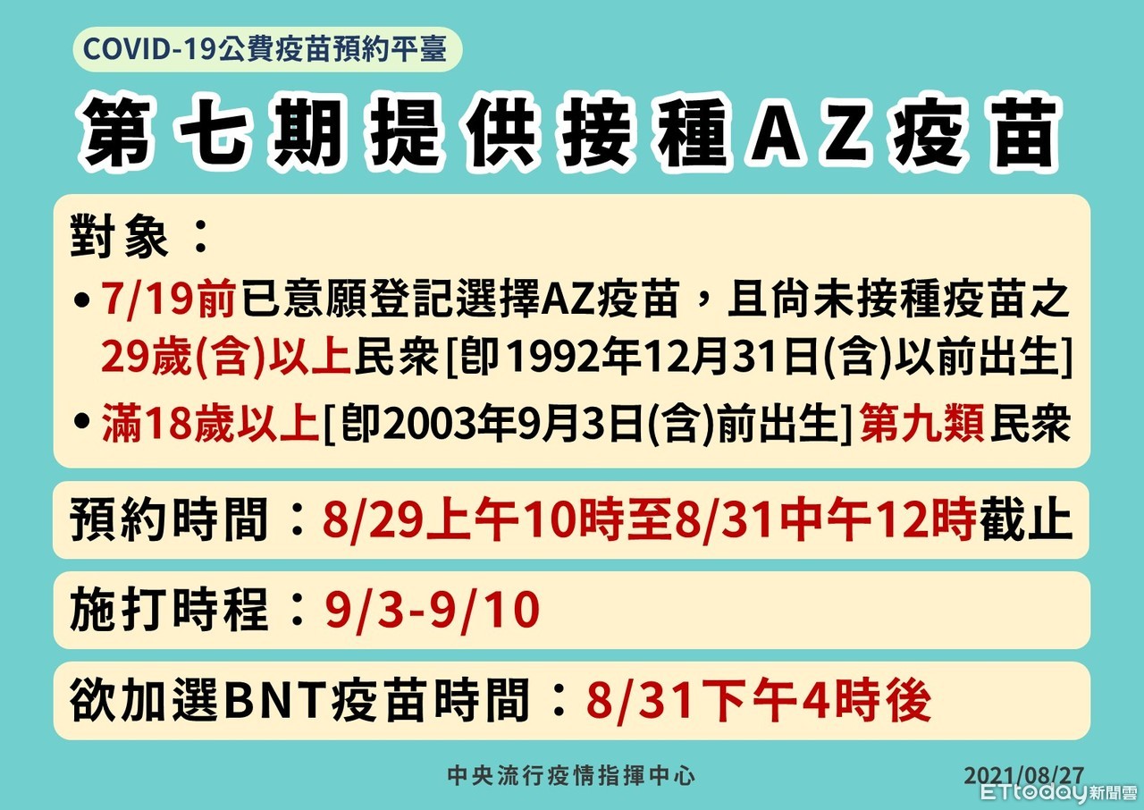 指揮中心從8/29早上10點至8/31中午12點開放第七輪AZ疫苗預約,將提供於7/19前已意願登記選擇AZ疫苗,且尚未接種過疫苗的29歲(含)以上對象(即1992年12月31日(含)以前出生),及滿18歲以上(即2003年9月3日(含)前出生)第九類對象進行接種,施打期間預計自9月3日至9月10日止,並視疫苗供應期程調整接種場次。