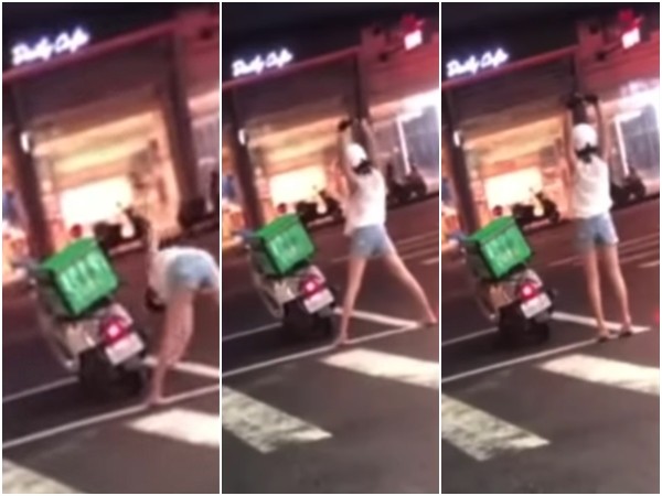 ▲▼一名女外送員在等紅燈時做健康操伸展。(圖/翻攝爆料公社二社)