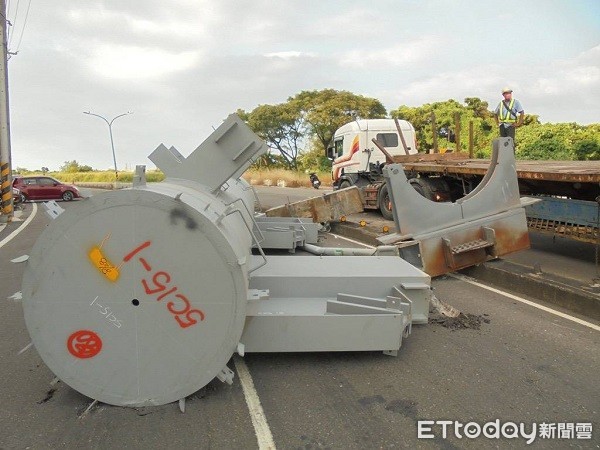 據了解,葉姓男子駕駛拖車載運重達數十公噸器具,先從觀音區中山路一段右轉至成功路3段時並未掉落,但到下一個左轉時,鋼構器具卻自板車上滾到對向車道,幸好當時未有人車經過,但大型鋼構掉落也佔據雙向車道,警方也封鎖成功路3段,讓拖吊車進行清理作業。