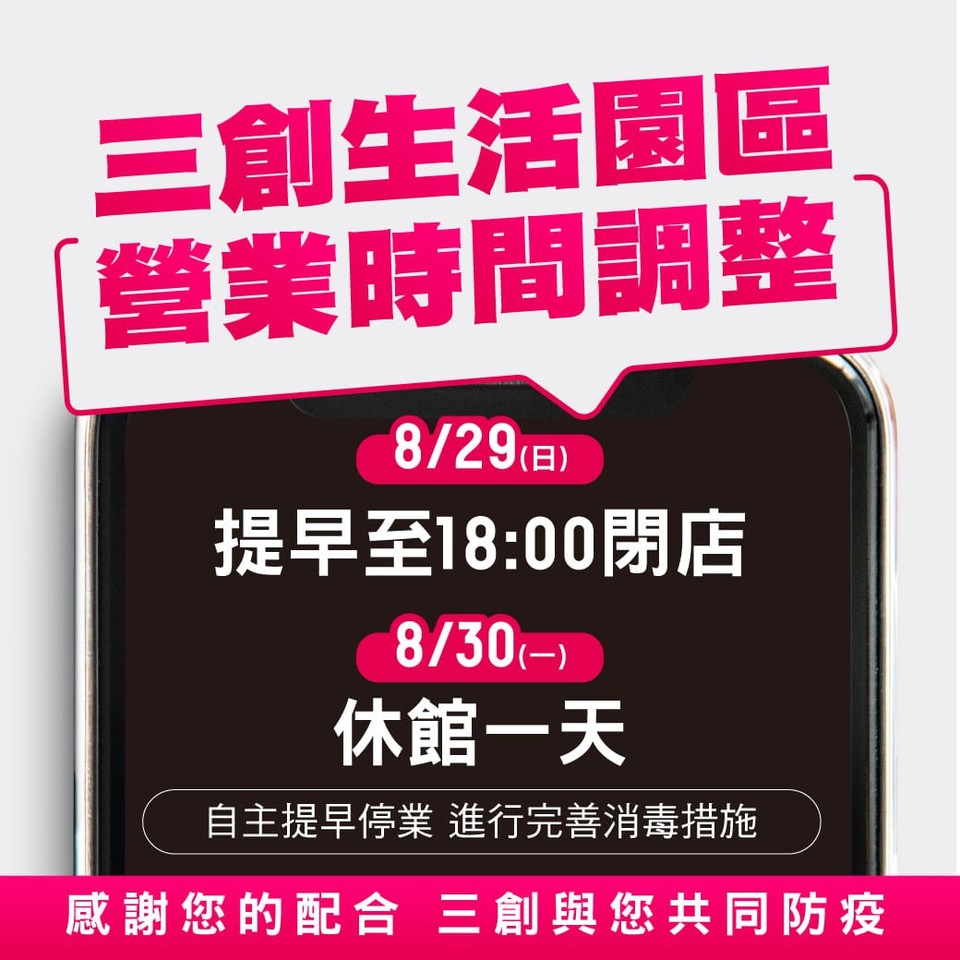 三創生活園區29日於臉書指出,要進行營業時間調整,29日提早至晚上6時閉店,30日休館一天,「提醒大家外出時,請務必戴口罩及保持社交距離!」