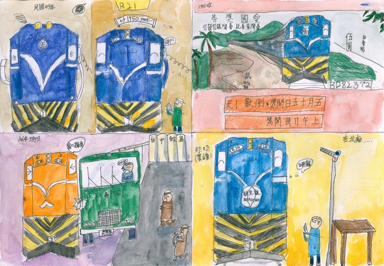 此次線上展覽,在「爸爸、媽媽、鐵道、車站還有我」主題系列畫作中,可以看到他和家人旅行時搭乘各式鐵道車輛留下的美好回憶,以及他對支線鐵道、古蹟建築的熱愛。而在「車站主題創作」中,其中玉里車站畫作裡,還能看到被稱作「白鐵仔」的光華號列車退役前,在花東線運行的景象。最特別的還有他到國家鐵道博物館籌備處參觀後,以鐵博籌備處修復典藏的「R24號柴電機車」為題創作的畫作。