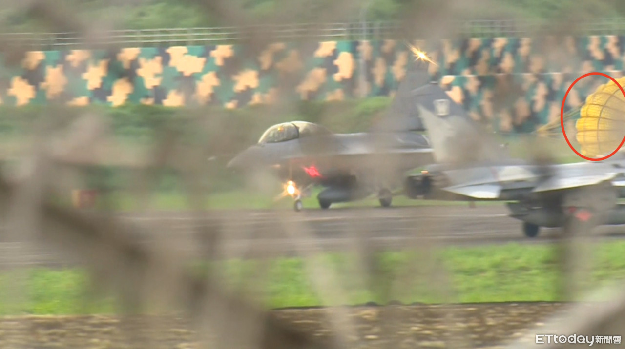 ▲F16V降落衝出跑道,後面還有拋傘 。(圖/記者吳奕靖翻攝)