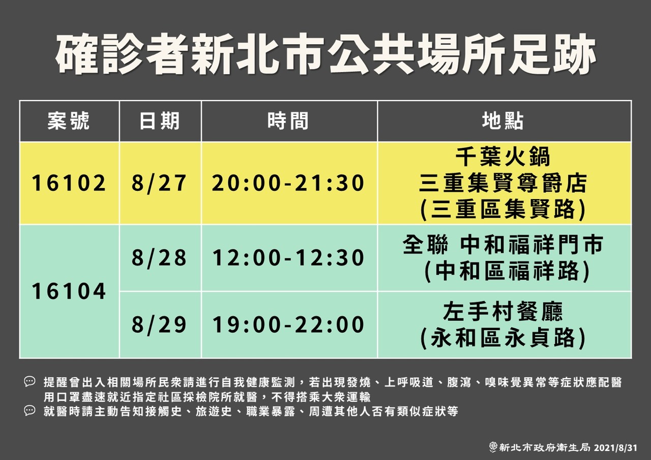 新北市今(31日)新增2例本土,五股1例、中和1例;衛生局下午公布最新足跡,案16102於8月27日曾前往千葉火鍋三重集賢爵店;案16104於8月28日前往全聯中和福祥門市,8月29日到過原住民料理店左手村餐廳。