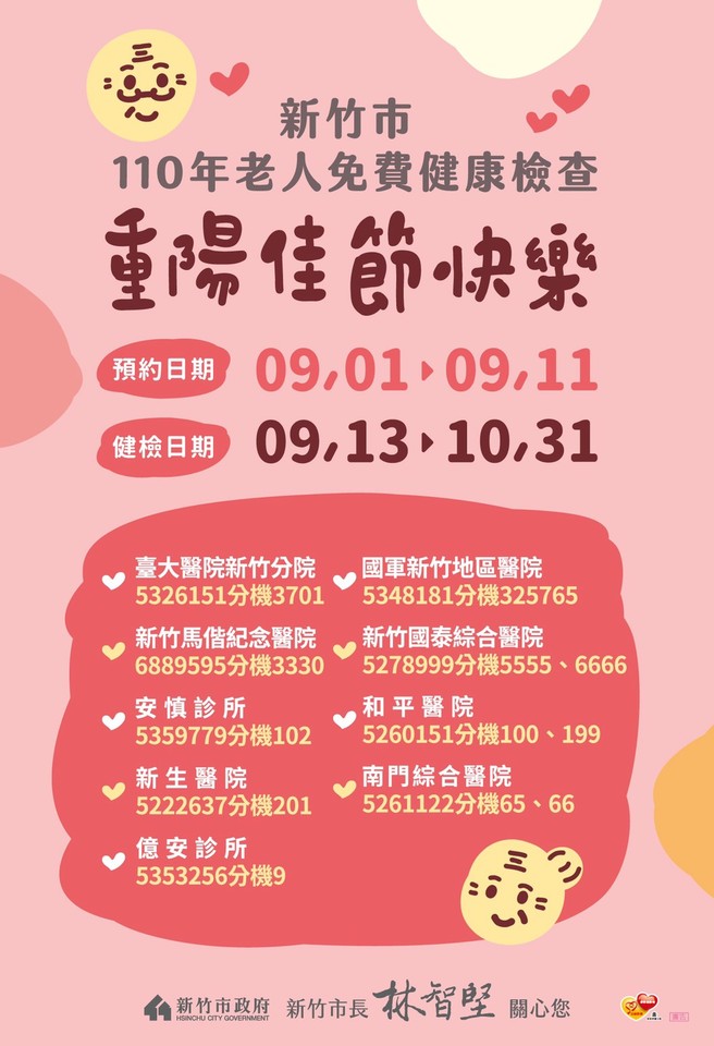 林智堅表示,新竹市是幸福城市,感謝過去長輩們努力打拚,為這城市奠下良好發展基礎。每年重陽節前夕,市府除致贈重陽敬老禮金,更辦理老人免費健康檢查。今年長者免費健檢,明起至9月11日可致電今年提供服務的9個醫療院所預約報名,預計9月13日起至10月31日進行健檢。