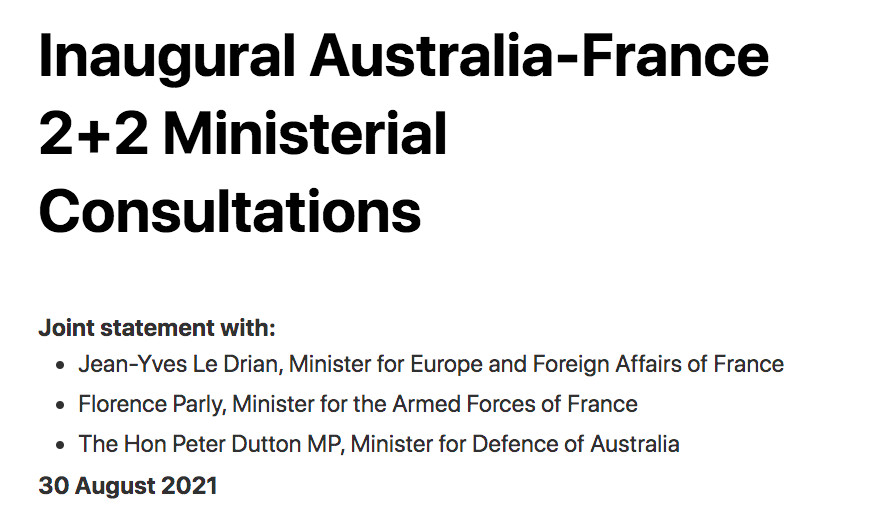 法國外交部長Jean-Yves Le Drian及國防部長Florence Parly於30日,與澳洲外交部長Marise Payne及國防部長Peter Dutton進行「2+2」視訊諮商會議。