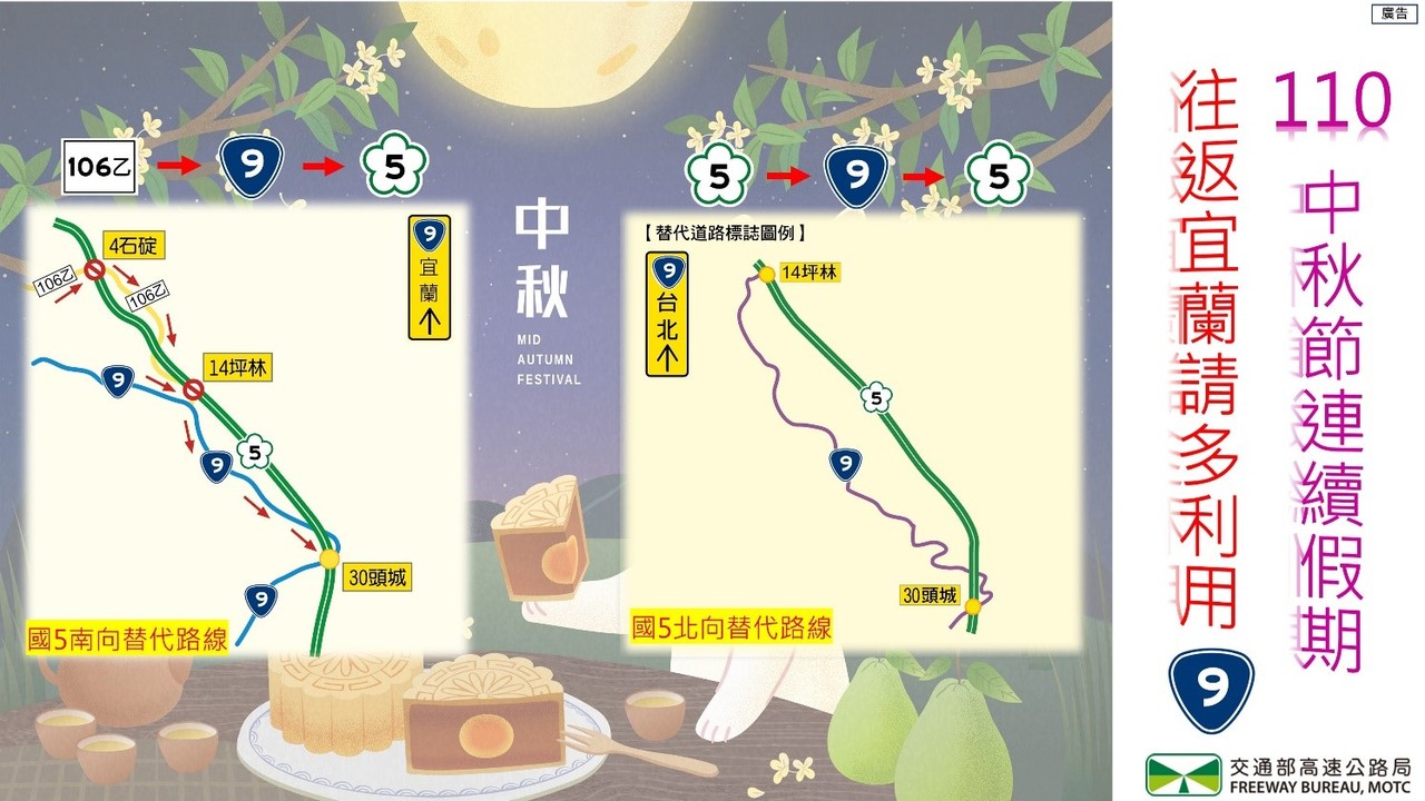 高公局預判,在中秋節連假前1日(9月17日)9-24時、9月18日5-16時及9月19日6-16時,國5南向南港系統至坪林路段將湧現往宜蘭方向車流;而北向宜蘭至坪林等路段,於9月19日15-24時、9月20日11-24時及9月21日10-18時容易發生車速低於每小時40公里壅塞情形,整體旅行時間恐將為平常的5至7倍。