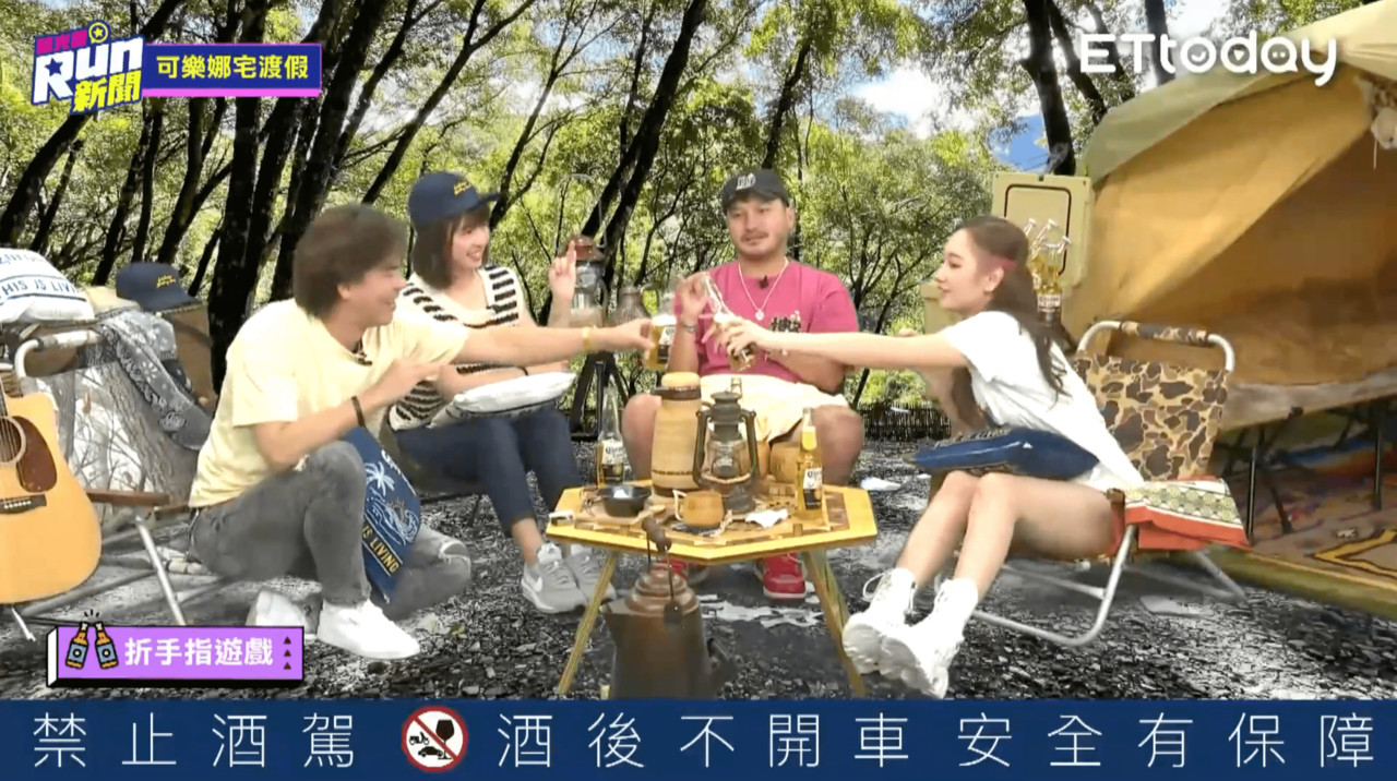 ▲一邊喝「Corona可樂娜」一邊跟來賓柯有倫(左一)、吳卓源(右一)玩遊戲,讓KID(右二)笑說下次跟峮峮主持RUN新聞時還想這樣玩。(圖/翻攝自影片,下同)