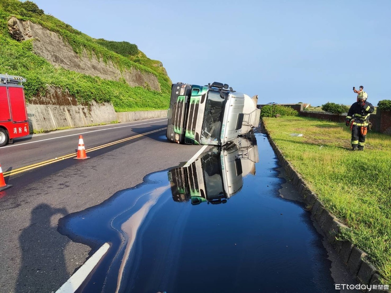 ▲新北瑞芳台2線化學槽車翻覆,硫酸滲漏滿地。(圖/記者郭世賢翻攝)