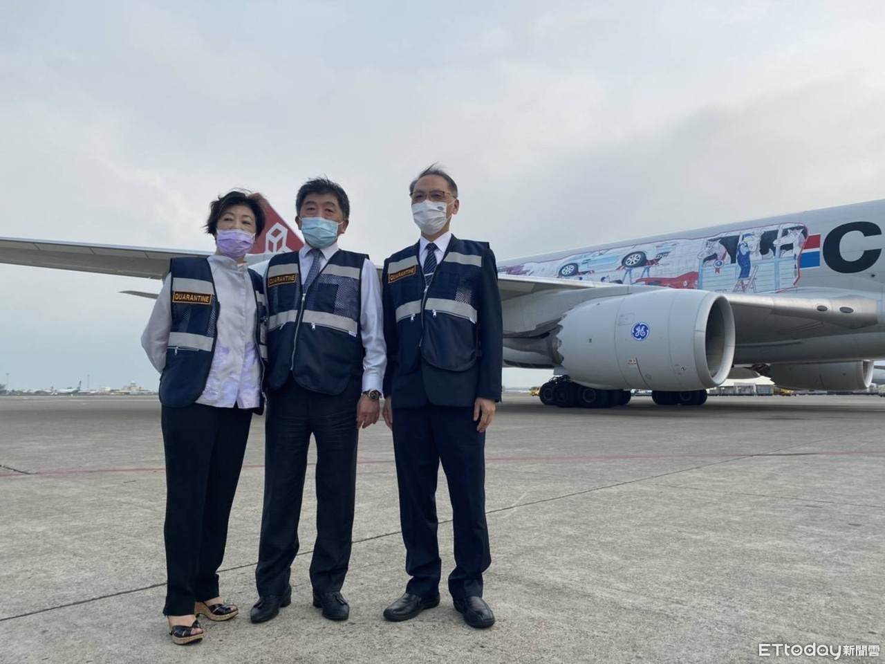 代表政府接機的衛福部長陳時中致詞時指出,感謝台積電、鴻海及慈濟與法律團隊一起努力,克服所有困難簽訂合約,陳時中代表衛福部向台積電、鴻海及慈濟,表達感謝、感謝、再感謝。