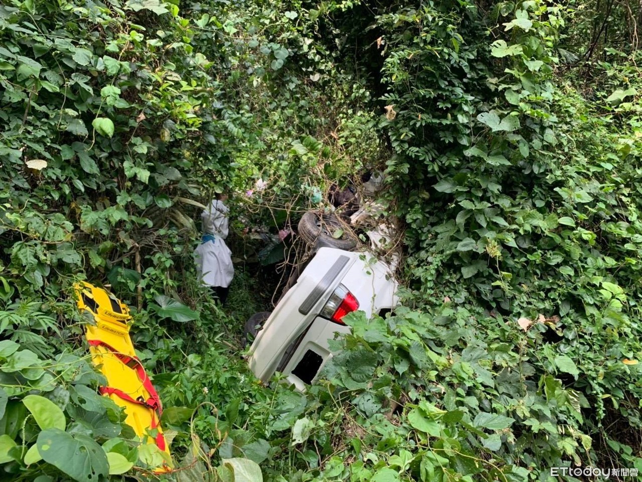 ▲從台中來苗栗爬山的郭姓婦人,因不熟路況,整輛車翻落山谷,所幸被樹叢勾住,沒有繼續往下掉,才挽救一命。(圖/記者黃孟珍翻攝)