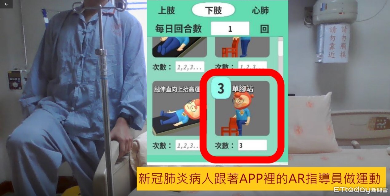 台北榮總心肺復健團隊為強化新冠肺炎住院患者心肺耐力,特別運用擴增實境(AR)技術,研發「視訊復健APP」,結合通訊軟體,讓病人在隔離治療時即可依運動處方積極復健。