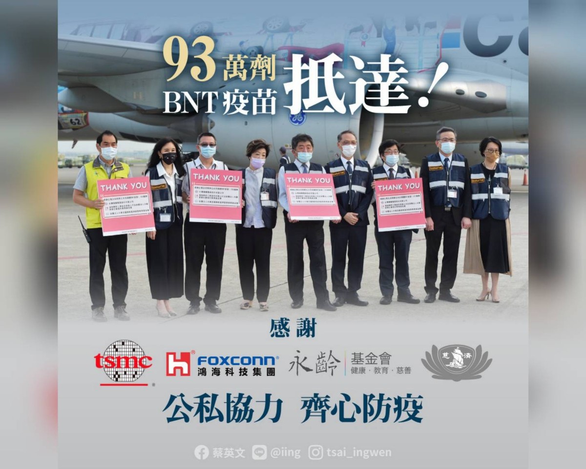蔡英文表示,感謝鴻海、永齡基金會、台積電及慈濟共同捐贈1500萬劑BNT疫苗,今天一早第一批93萬劑疫苗已經順利抵達桃園機場。