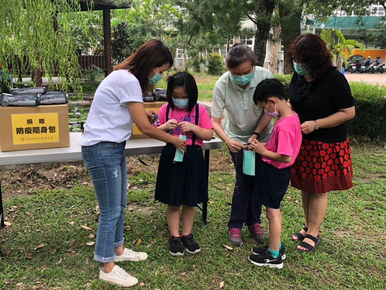 防疫隨身包由多位志工媽媽協助包裝及製作,內有酒精、乾洗手液、口罩以及口罩掛繩。學生開心地拆封防疫包,互相討論掛繩花色樣式,廖同學開心的拿到防疫包打開掛繩跟大家分享,上學前都會幫弟弟掛口罩掛繩,現在我也有屬於自己的掛繩了。