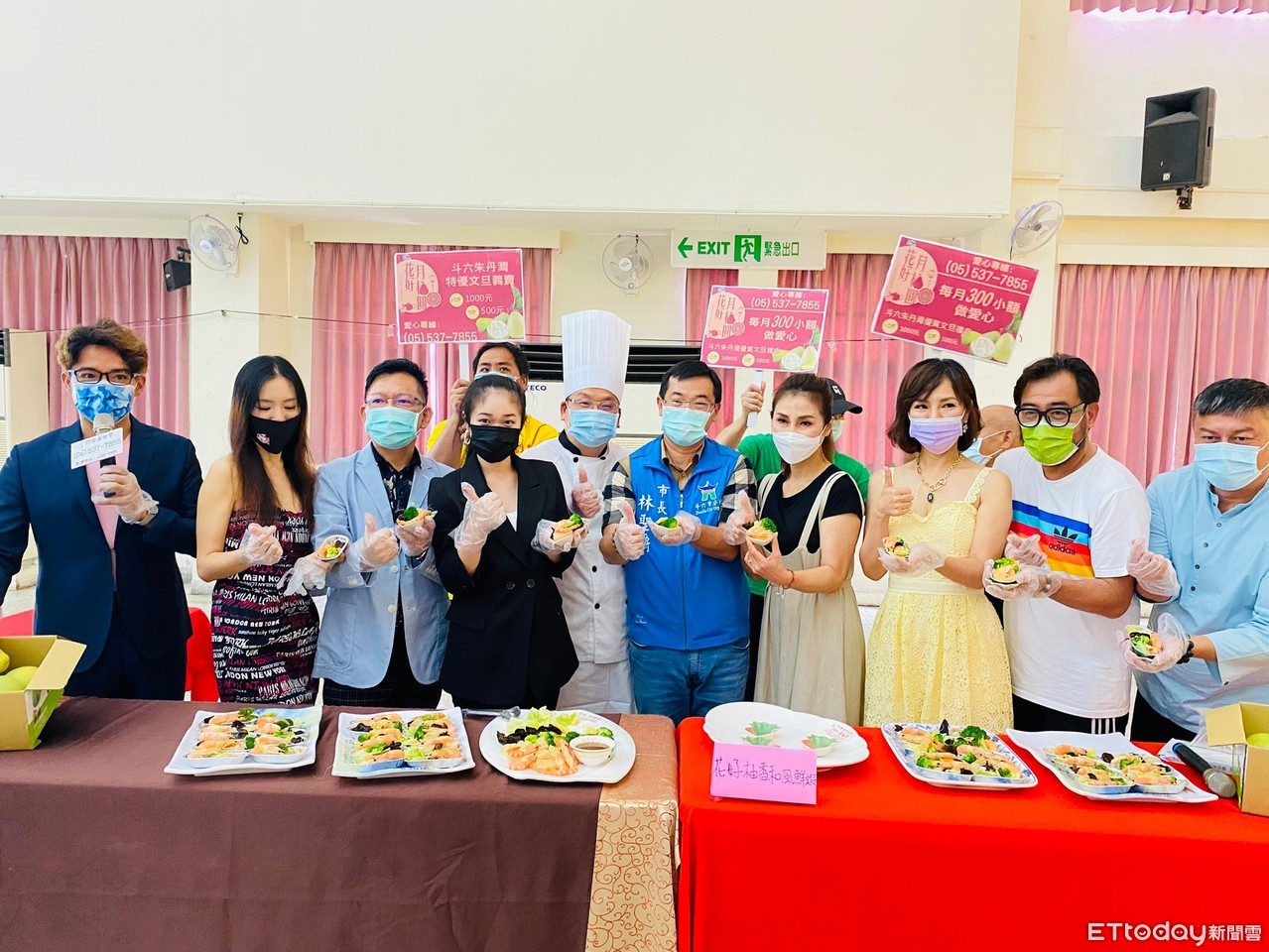 ▲市長林聖爵及現場多位藝人邀請社會大眾能認購文旦、月餅禮盒,發揮力量做愛心,所得全數支持植物人常年服務經費。(圖/記者蔡佩旻翻攝)