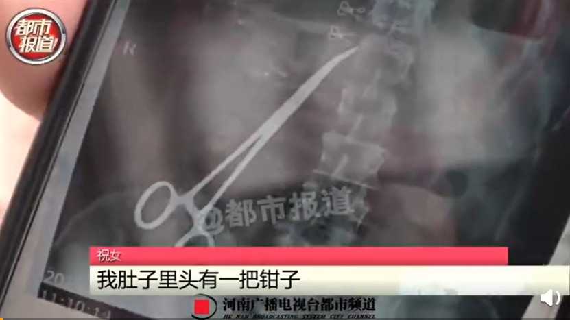 祝姓女子近來向《都市報導》表示,她去年6月在禹州市婦幼保健院剖腹產下一名男嬰,然而1個月後卻開始出現嚴重腹痛與腰痛,「我真的好痛,我腰疼我啥都幹不成」,不但影響到家務,甚至有時會痛到無法走路,今年8月到禹州市中醫院檢查,才發現肚中有止血鉗。