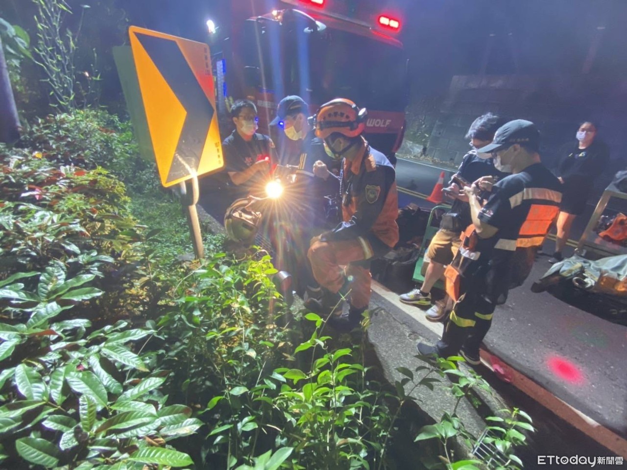▲▼女騎士深夜墜谷,現場只剩閃著方向燈的倒地機車,消防員凌晨2點多發現了包包與證件。(圖/記者陳雕文翻攝)