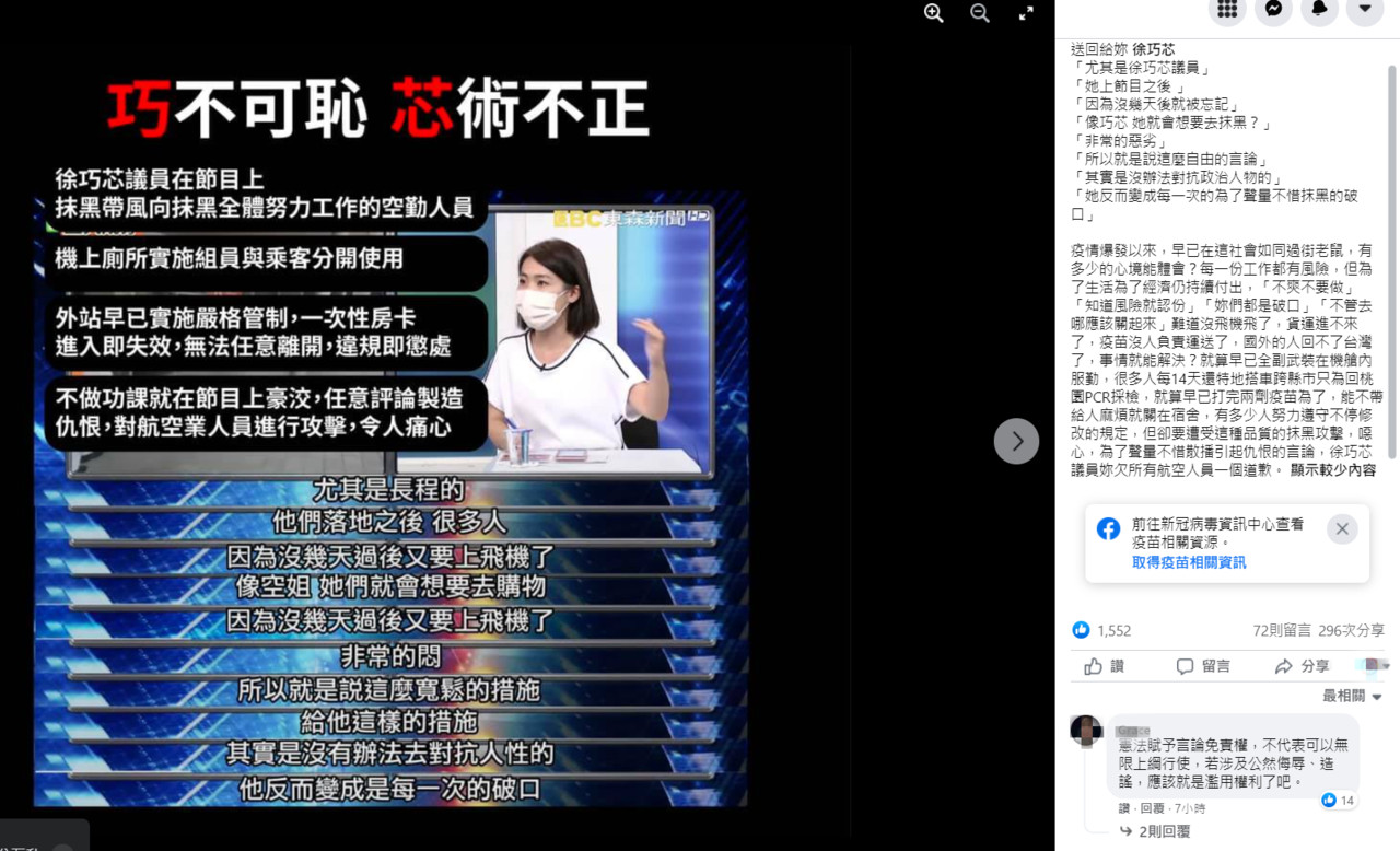 徐巧芯強調,她並不是指機組員的問題,而是政策的問題,「把影片看完而不是斷章取義的梗圖就可以明白我的意思。」