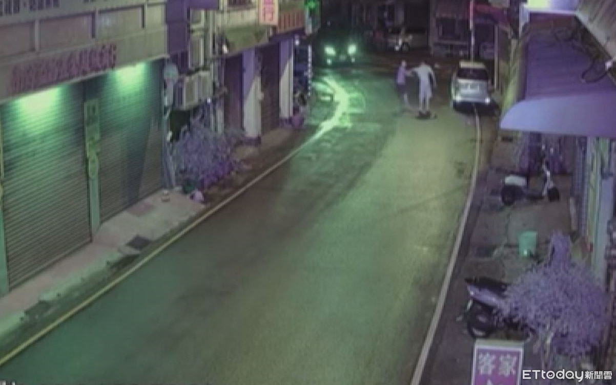 ▲王男(左)因不滿詹男在外放話他吸毒,4日晚間持槍到三義尋仇,2人在大街上拉扯扭打。(圖/記者黃孟珍翻攝)