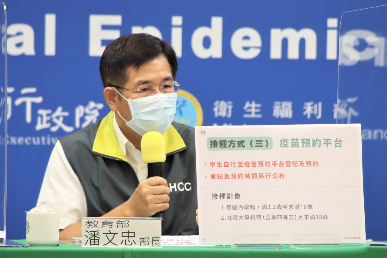 ▲潘文忠出席指揮中心記者會,說明學生接種疫苗方式。(圖/指揮中心提供)