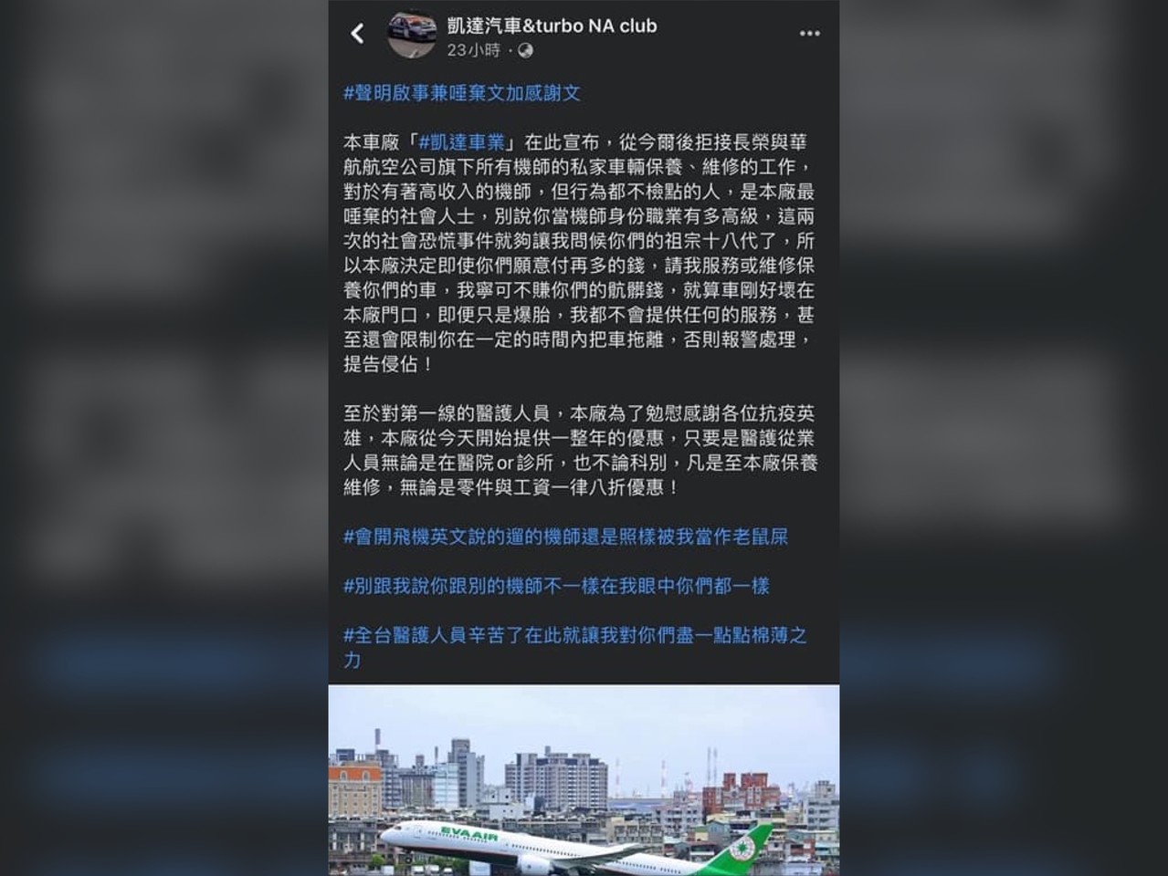 臉書《凱達汽車&turbo NA club》在臉書上貼出一則「聲明啟事間唾棄文加感謝文」,文中寫道,從今爾後拒接長榮與華航所有機師的私家車輛保養、維修工作,「對於有著高收入的機師,但行為都不檢點的人,是本廠最唾棄的社會人士」。