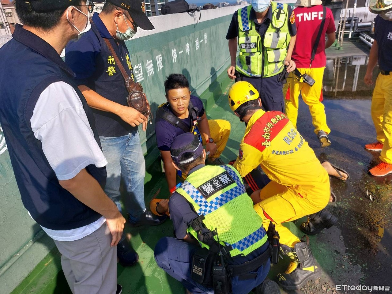 ▲林姓男子坐奇美醫院靠近中華路第一醫療大樓頂樓疑欲跳樓,幸好警、消人員處理得宜將他拉下強制保護,解除這場危機。(圖/記者林悅翻攝,下同)