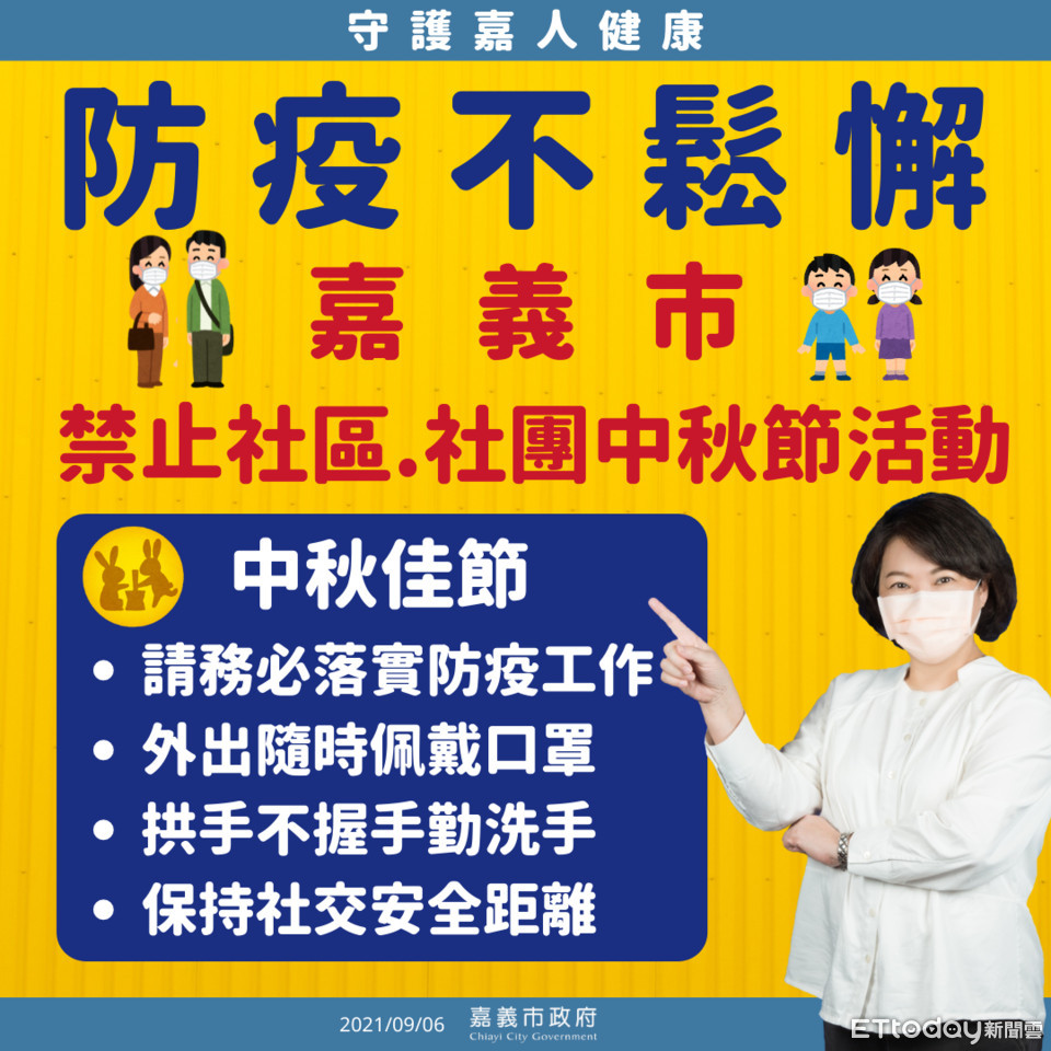 Delta等新冠肺炎變種病毒傳染力強,為守護嘉義市民健康,嘉義市政府衛生局6日宣布,社團社區中秋活動禁止 (例如:烤肉,集會,唱歌聯歡等) ,家人烤肉不限制, 實施時間為110年9月18日至110年9月21日。