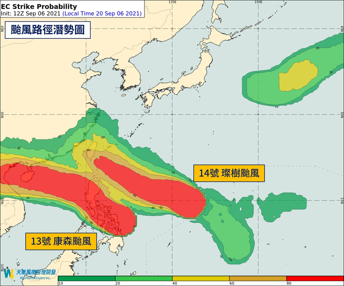 天氣風險指出,由於颱風路途遙遠,沿途海溫、發展條件適合,目前預報璨樹颱風將會發展成一顆小而強的颱風。至於第13號康森颱風,則持續往呂宋島移動,對台灣沒有影響,目前看起來對璨樹颱風的路徑影響程度也小。