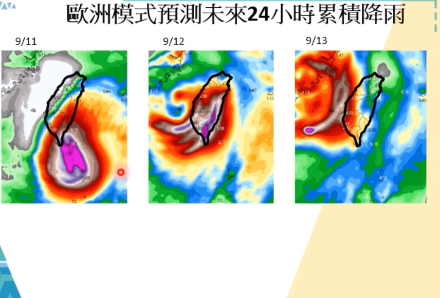 根據歐洲系集模式預測顯示,璨樹颱風周日將於台東南側、大武附近登陸,周六起巴士海峽、東半部風浪增大、降雨增加,颱風接近時,迎風面的花蓮以南、恆春半島將有明顯雨勢,周日颱風登陸,隨著西南風氣流影響,花蓮以南、高雄、屏東、台南、嘉義以南等地都會有明顯降雨,下周一颱風逐漸遠離,東半部降雨趨緩,中南部降雨則仍持續。
