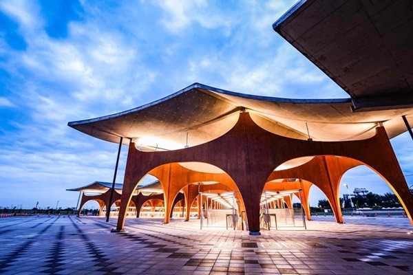南寮最美地標!實踐建築副教授林聖峰之「 嶼山工房 團隊」與「曾泊銘建築師事務所團隊」合作建築設計的新竹漁港直銷中心戶外攤商整建完工,「波光市集」就此出爐,波光市集為全台灣首處以海浪理念設計的海岸建築,主打「黃金沙灘色系」,波浪狀屋頂融入海港,夜晚還有光環境營造,讓絕美地標映照海景。