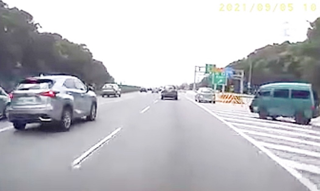 網友提供行車紀錄器影像中,銀色轎車從交流道上來後一路慢速,疑似未注意後方車道上疾駛車輛,竟慢速駛入主線車道,還跨越槽化線,幸好後方車都保持足夠車距,發現三寶車要切入連忙急閃,其中1輛綠色廂型車急剎轉向差點翻車,包括三寶車在內最後雖然都平安,但PO文者認為,這樣的行為真的非常不可取,若造成重大事故可真的不是開玩笑。